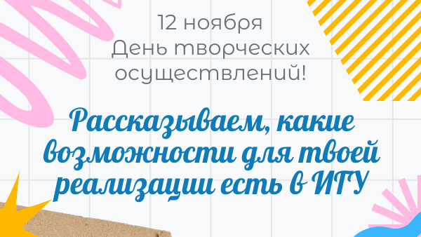 12 ноября — лучший момент, чтобы попробовать себя в чём-то новом. И в этом тебе поможет Центр культуры и досуга ИГУ!